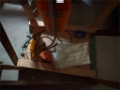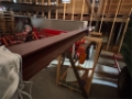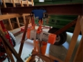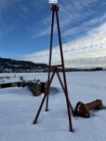 Hjemmelaget storsekkløft til lasting av såmaskin, to bukker og en topp bom for å legge oppå, talje henger i midten.